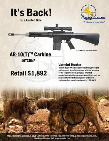 This AR-10(T) Carbine Combines the light weight and compact size of the carbine with the accuracy of the Target Model to give you a rifle that outperforms all other carbines. You will be ready on your next hunt with the easy carry and weather resistant stainless steel barrel chambered in 7.62 NATO.