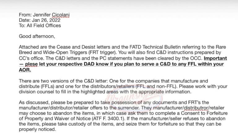 FPC Law is investigating a purported internal ATF email alleging that businesses which manufacture, distribute, or sell ‘forced-reset triggers’—specifically referring to “Rare Breed and Wide-Open Triggers (FRT Trigger).”— will be subject to forfeitures if they do not surrender “documents and FRT’s” [sic].