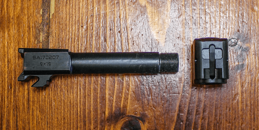 Barrel: 3.8″ Hammer forged steel w/ compensator, threaded (.5 x 28), Melonite finish