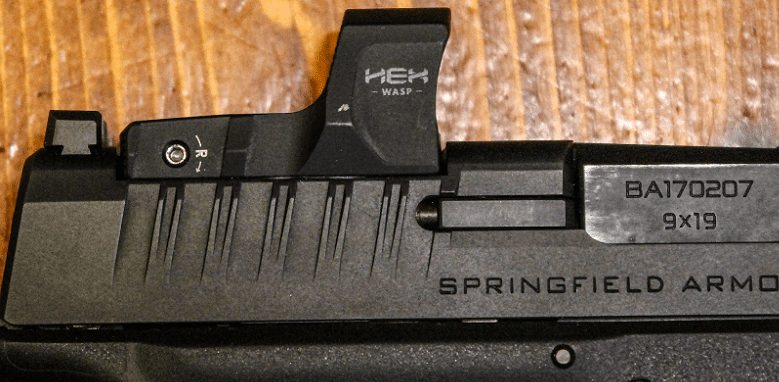 Sights: Tritium/luminescent front, tactical rack U-notch rear, HEX Wasp red dot
