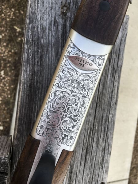 Which is easy enough to see. Unlike the base models in Stevens’ 555 line, the E (for enhanced) version sports nicely figured laser engraved filigree on its aluminum receiver.